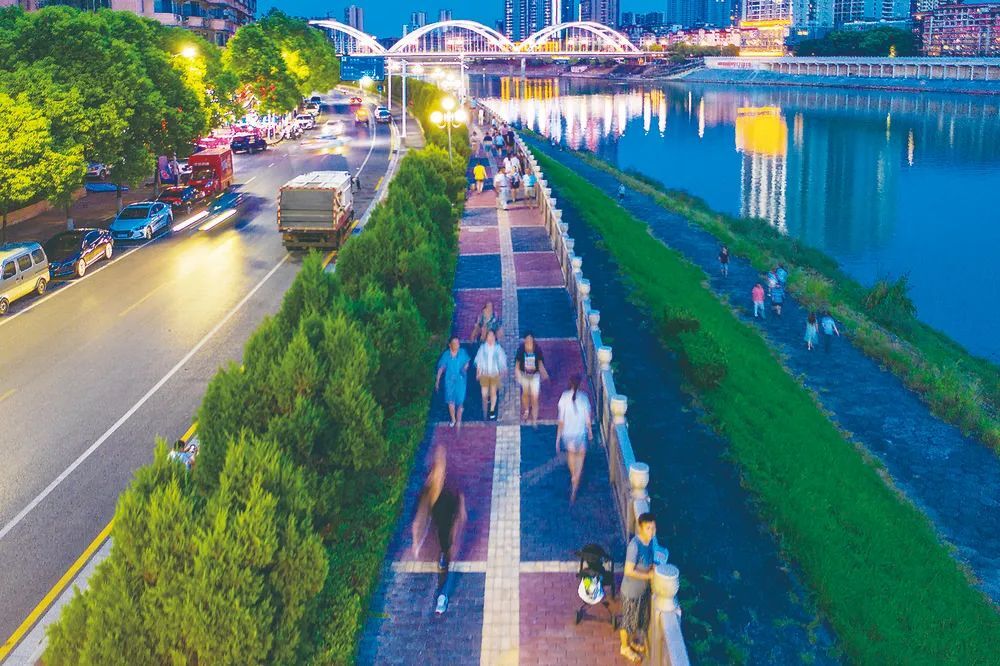 炎炎夏日,市民在江北防洪大堤上散步纳凉,享受资江风光。
