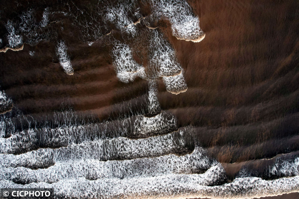 ↑2022年8月31日是农历八月初五,逢钱塘江八月秋潮大潮汛日,在浙江省海宁市黄湾镇,钱塘江南潮在冲击北岸海塘后折返江中,与东潮再次形成“交叉潮”。(无人机拍摄)CICPHOTO/沈达 摄