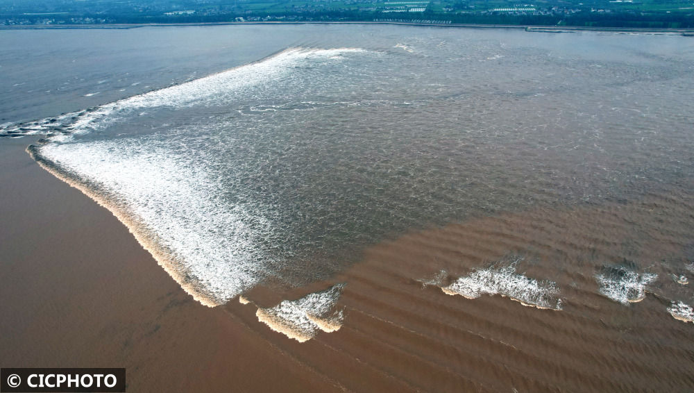 ↑2022年8月31日是农历八月初五,逢钱塘江八月秋潮大潮汛日,在浙江省海宁市黄湾镇,钱塘江南潮与东潮在江面上交叉会合后激起浪花。(无人机拍摄)CICPHOTO/沈达 摄