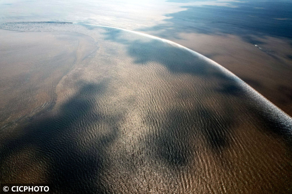 ↑2022年8月31日是农历八月初五,逢钱塘江八月秋潮大潮汛日,钱塘江潮水在江面上交叉会合后激起浪花。(无人机拍摄)CICPHOTO/沈达 摄