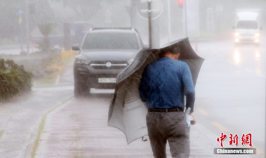 当地时间9月5日,据韩国气象部门消息,今年第11号台风“轩岚诺”正缓慢北上,预计将于当地时间6日凌晨1时左右最为接近韩国济州岛,并于6日上午7时左右从韩国南部海岸登陆。登陆后,“轩岚诺”将持续减弱,预计6小时后从韩国东部海岸离开。包括韩国济州岛及南海岸地区在内的韩国多地5日起将出现强风以及强降雨。图为当地时间9月5日,在韩国济州岛城山邑,一位市民在雨中撑伞前行。 图片来源:视觉中国