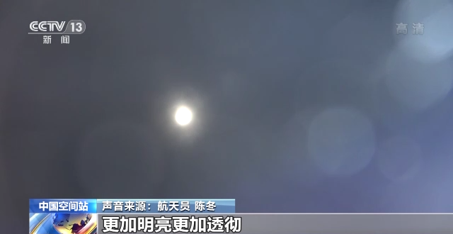 航天员 陈冬:这是我们在空间站看到的月亮,与地面相比,我们可以在白天去拍摄月亮,而且因为没有大气及云的干扰和影响,我们在空间站看到的月亮更加明亮,更加透彻。