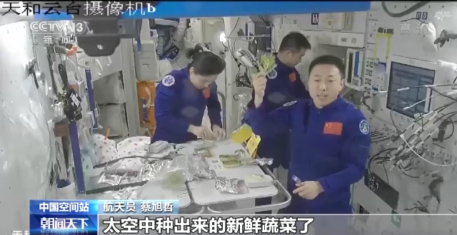 航天员 蔡旭哲:我们一会儿就准备吃太空中种出来的新鲜蔬菜了。