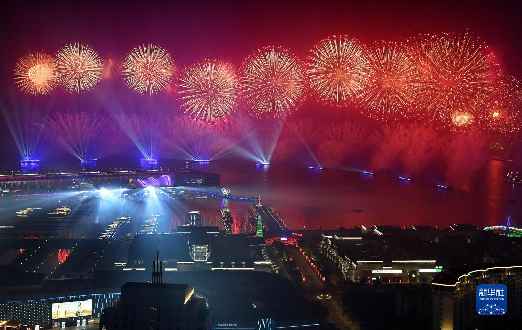 这是2018年6月9日晚在青岛举行的《有朋自远方来》灯光焰火艺术表演。2018年6月9日至10日,上海合作组织成员国元首理事会第十八次会议在青岛召开。新华社记者 李紫恒 摄