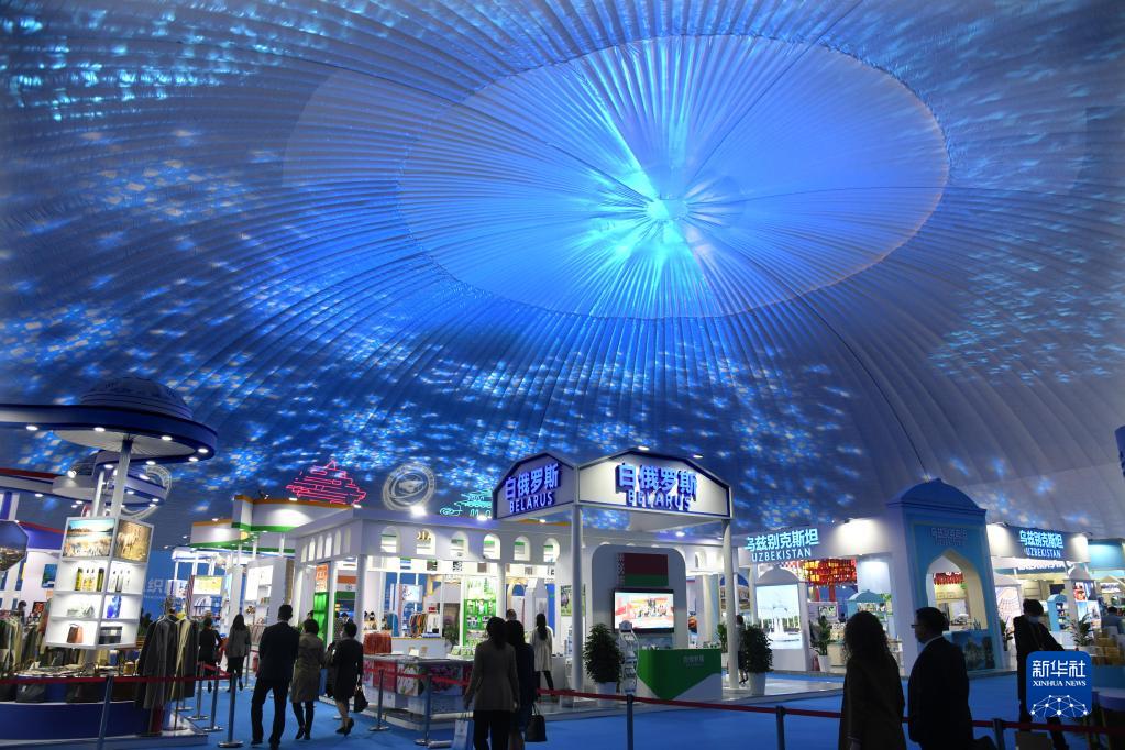 与会嘉宾在各国形象馆展区参观(2021年4月26日摄)。当日,2021上海合作组织国际投资贸易博览会暨上海合作组织地方经贸合作青岛论坛在青岛开幕。新华社记者 李紫恒 摄