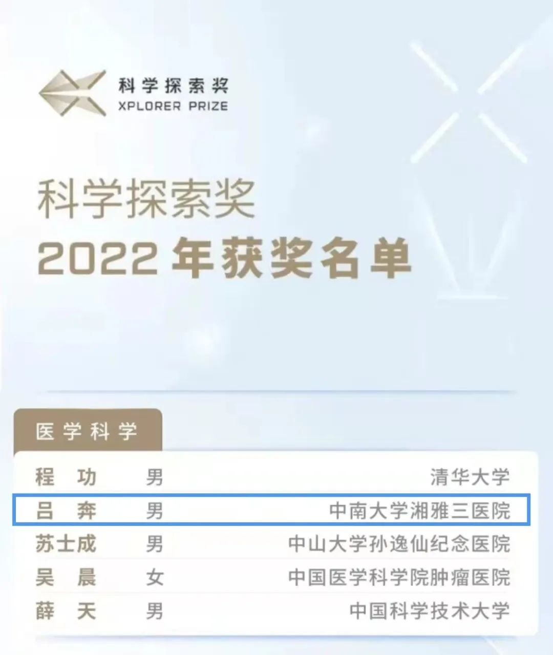 湖南日报9月15日讯(文字/视频 全媒体记者 王铭俊 通讯员 李姗)今天,第四届“科学探索奖”获奖名单正式揭晓,50位青年科学家榜上有名。中南大学湘雅三医院特聘教授、博士生导师吕奔脱颖而出,成为“科学探索奖”医学科学领域的首批获奖人,也是湖南地区唯一获奖人。每位获奖人将在5年内获得总计300万元人民币奖金,并且可以自由支配奖金的使用。