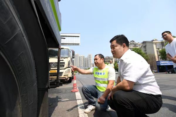 9月12日,长沙市谷丰中路,湘江新区行政执法局局长陶湘闽(前)在了解为莲花镇送水(保障居民基本生活用水需求)的情况。 湖南日报全媒体记者 田超 摄