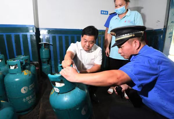 9月12日,长沙市岳华路一瓶装燃气站点,湘江新区行政执法局局长陶湘闽(左一)对燃气站监管工作进行抽查。 湖南日报全媒体记者 田超 摄