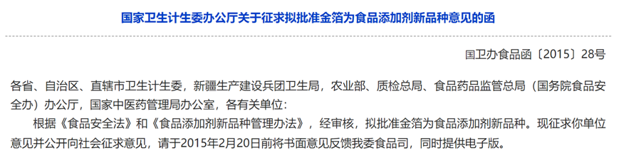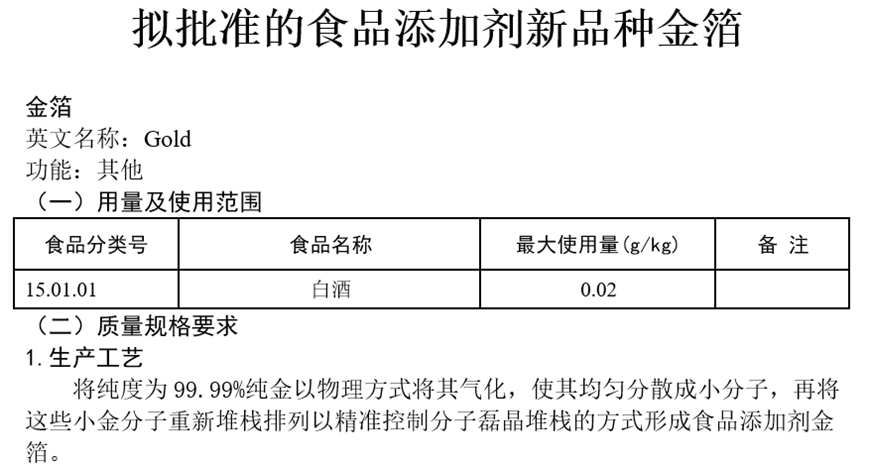 在 2015 年的时候,我国国家卫计委官网刊登了《国家卫生计生委办公厅关于征求拟批准金箔为食品添加剂新品种意见的函》,内容中拟批准金箔为食品添加剂新品种并允许添加入白酒,但至今也没有正式批准的文件。