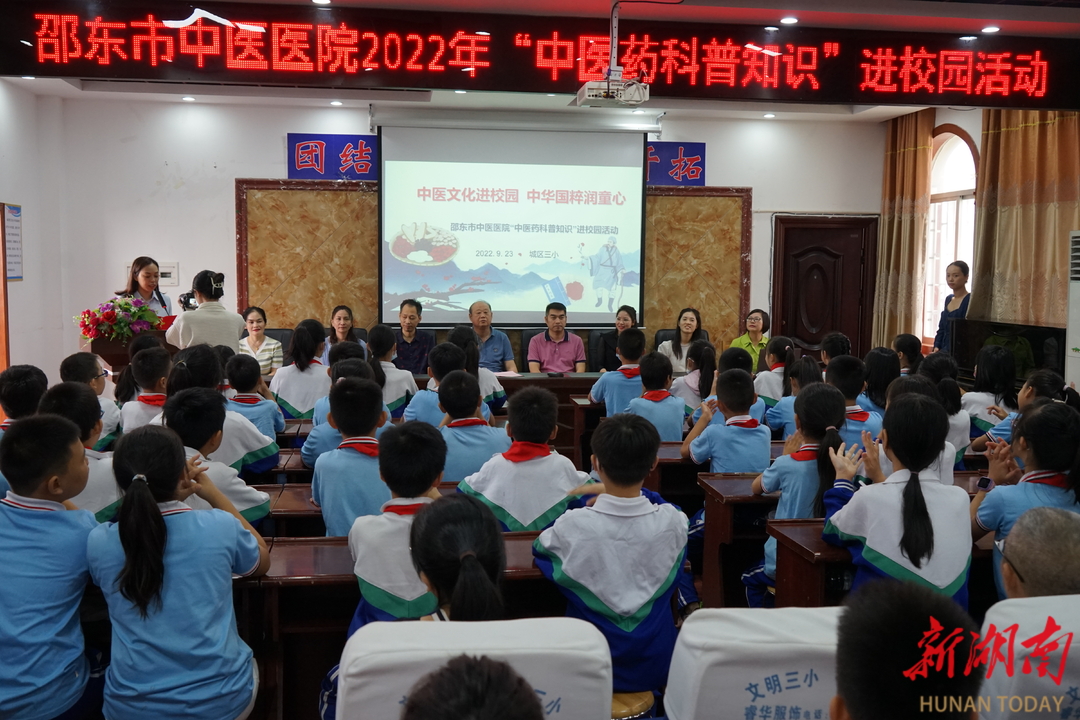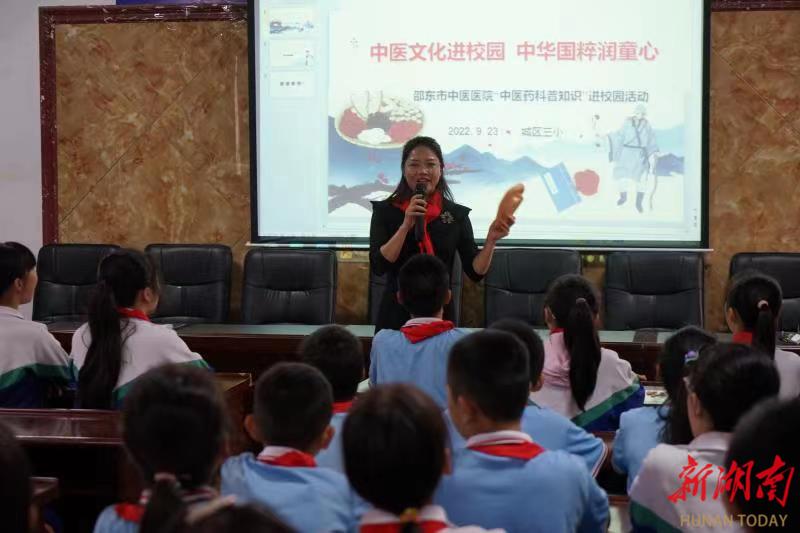 大众卫生报·新湖南客户端9月24日讯(通讯员 周小将 肖洁)9月23日,邵东市中医医院党委书记刘耕野、纪委书记赵勇等院领导带领该院新时代文明实践医疗卫生服务分队志愿者,走进城区三小开展“中医药文化进校园”活动。