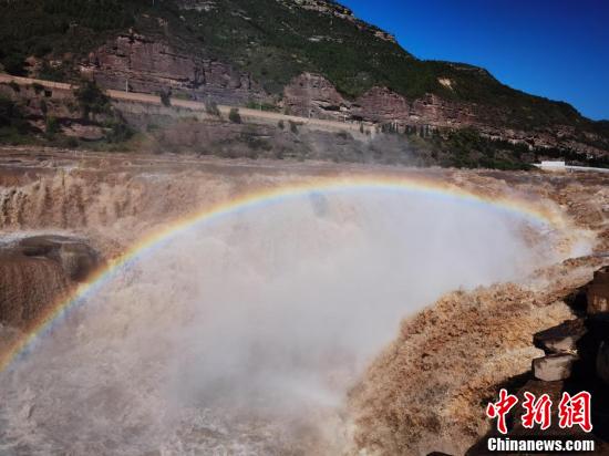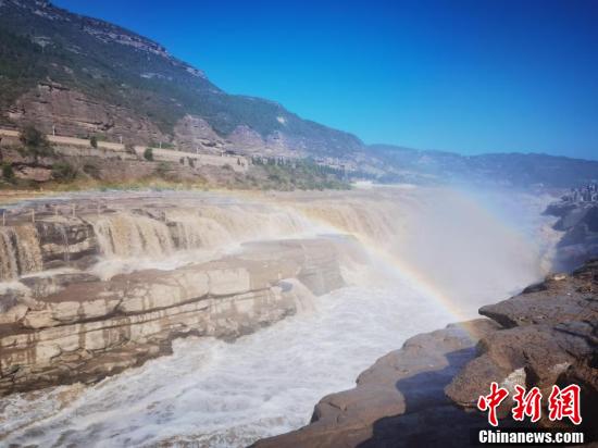 秋高气爽,山西黄河壶口瀑布出现彩虹通天美景。 张辉 摄