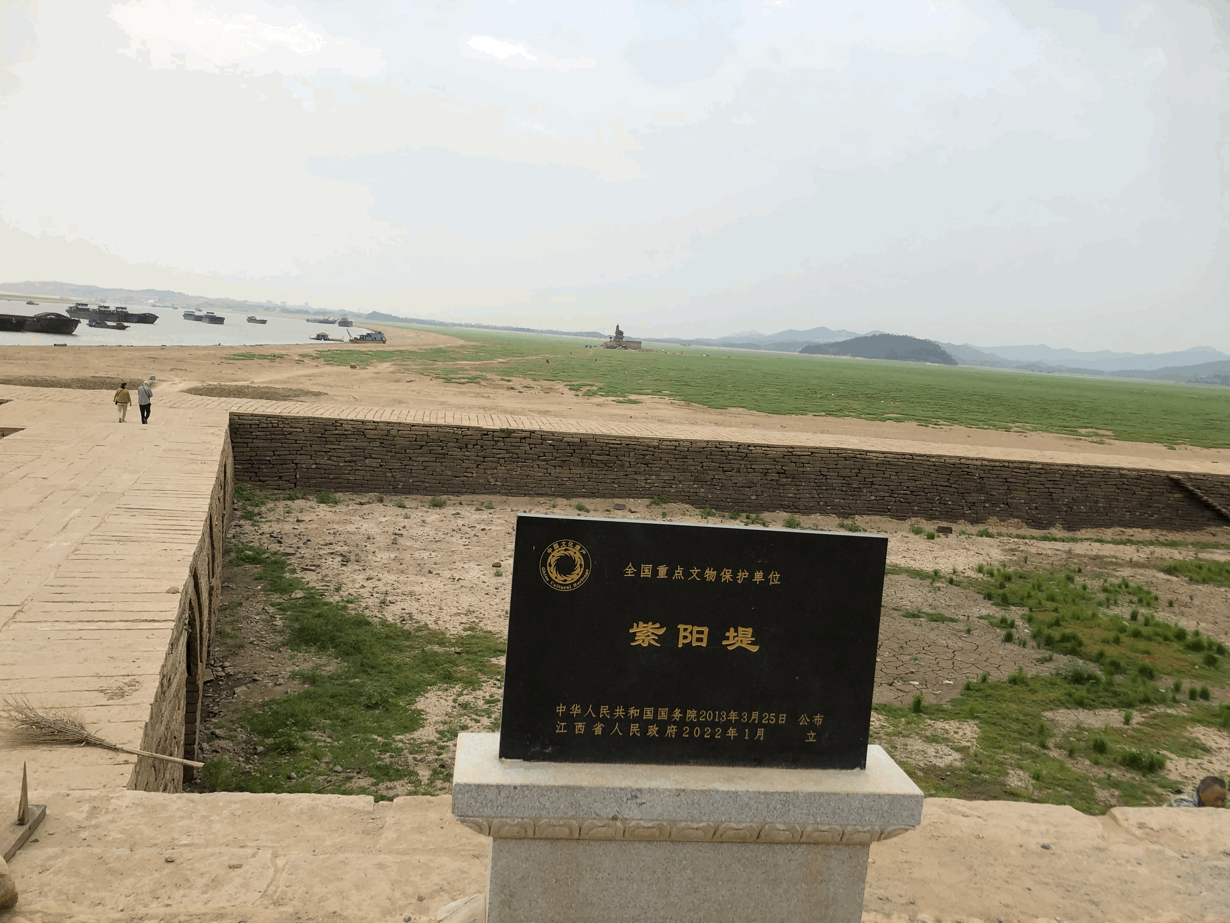 数据显示,8月19日,鄱阳湖星子站水位退至9.99米,进入低枯水期(水位10米以下)。截至8月23日16时,星子站水位仅为9.5米,为71年来同期最低水位。同时段监测鄱阳湖的湖区通江水体面积缩至560平方公里,是往年的五分之一。此时,落星墩已完全裸露出来。