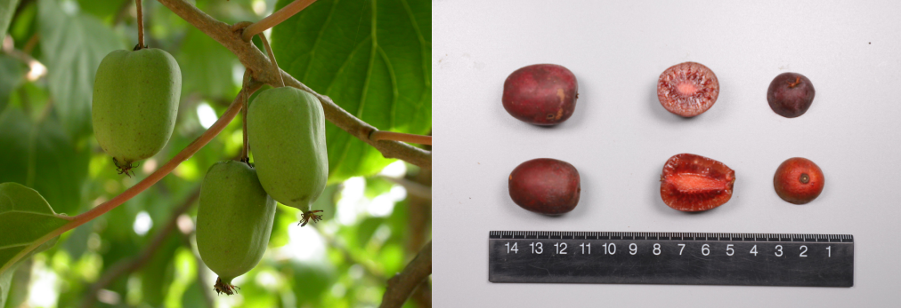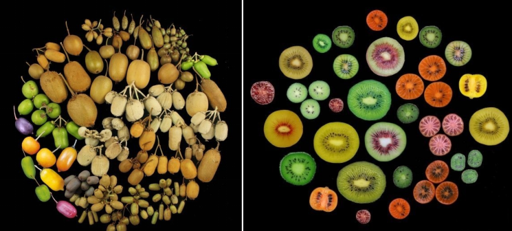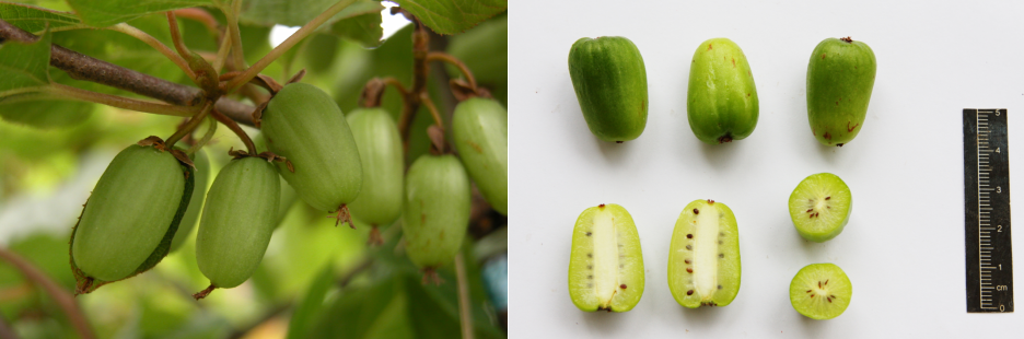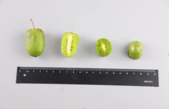 不同种类的猕猴桃从外观到口味都千差万别。果实形状有圆柱形、卵形、倒卵形、球形等至少 15 种类型;果肉颜色存在从绿色、黄色、黄橘色、粉色到紫色的广泛变异;果皮毛被从光滑无毛到刺毛猕猴桃的长硬毛,呈现广泛连续的变异;果实风味更是酸、甜、苦、辣、麻应有尽有。