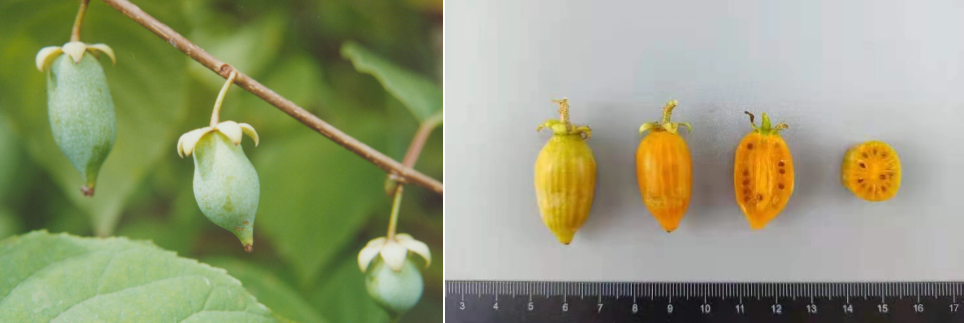 例如,“大籽猕猴桃”未成熟时果肉为淡绿色,成熟时变为橘黄色,其风味麻辣,不能直接食用。