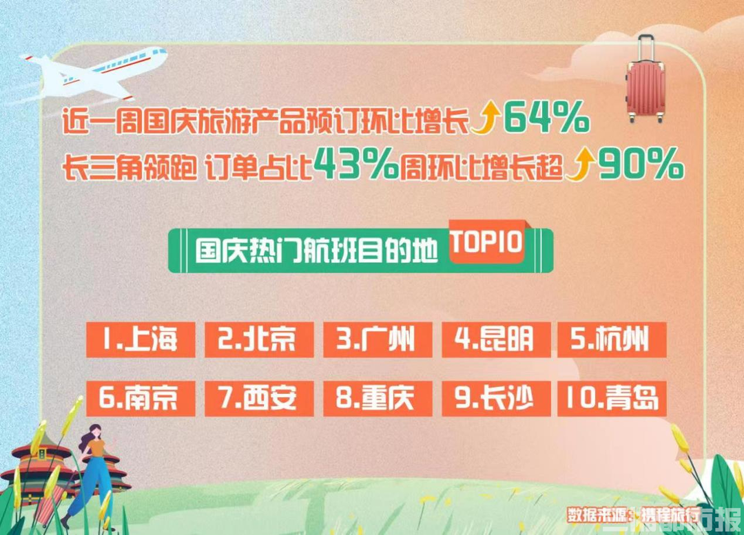 近期长三角区域疫情趋稳,使得长三角城市群的出游需求快速释放。从当前国庆旅游的预订区域来看,长三角继中秋之后,再次领跑国庆旅游市场。报告显示,长三角地区,近一周国庆旅游预订环比增长超90%,远高于大盘增速。其中近一周预订国庆期间到湖南旅游的产品订单环比上周增长107%。