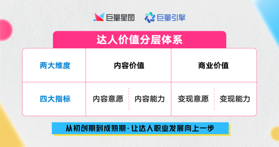 为助力达人长期职业发展,巨量星图推出了一套全新的“达人价值分层体系”,从两大维度、四大指标,帮助处于不同阶段的达人实现确定性成长和跃迁。