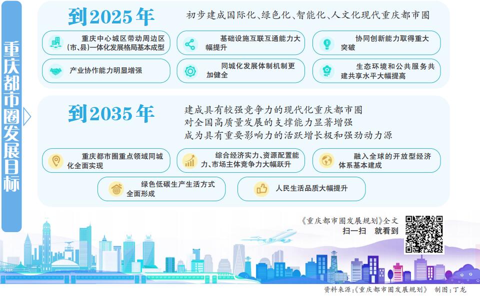 到2035年,重庆都市圈重点领域同城化全面实现,综合经济实力、资源配置能力、市场主体竞争力大幅跃升,建成具有较强竞争力的现代化重庆都市圈。