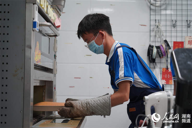 学生从烤箱里端出面包胚。人民网记者 李芳森摄