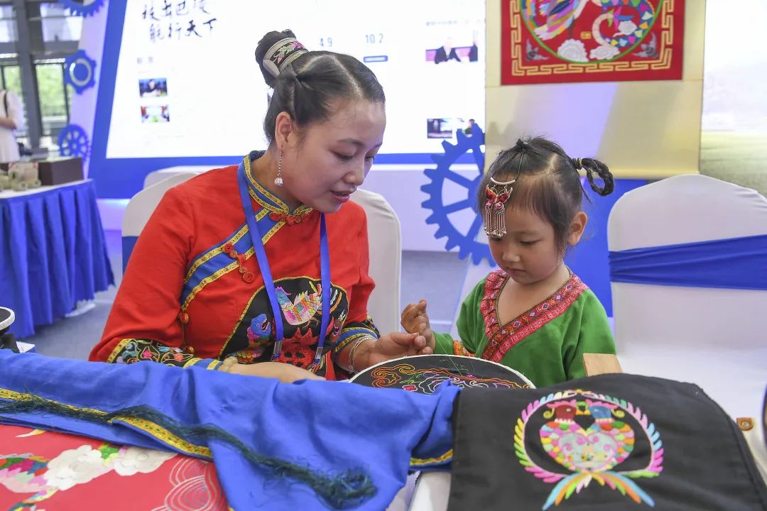 (7月4日,株洲神农大剧院,技能人才成果展示区,4岁的龙浠跟着母亲伍前金在学习城步苗绣。湖南日报全媒体记者 辜鹏博 李健 摄影报道)