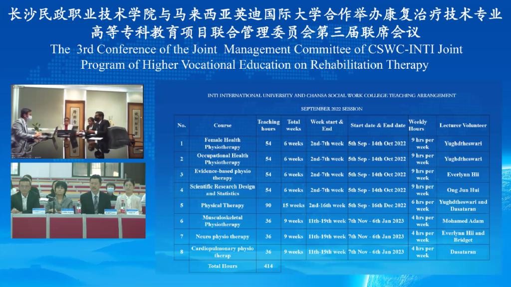 项目联合管理委员会联席会议根据《长沙民政职业技术学院与马来西亚英迪国际大学合作举办康复治疗技术专业高等专科教育项目联合管理委员会章程》每年举行一次,对项目的发展规划、年度方案等重大事项进行审定与决议。本次会议审定项目年度实施方案,为项目在2022-2023学年度的提质运营指明并提供了切实可行的实施路径。