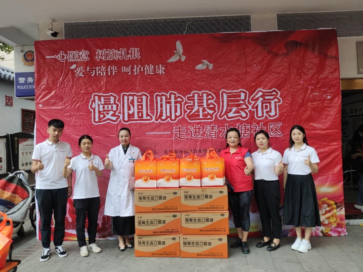 在活动现场,由长沙市第一医院的医生们带来的健康大讲堂热闹非凡,结合实际为大家讲解呼吸、中医、康复、护理等健康知识,深受居民们的认可。在随后的义诊环节,6名来自呼吸科、中医科及血液肿瘤科的知名专家和青年专家为居民提供呼吸系统、血液肿瘤等疾病咨询及健康问诊,详细解答群众的疑惑。现场还进行了日常保健、护理以及常见病多发病的防治知识宣教,并向居民们免费赠送了天劲牌强骨生血口服液。