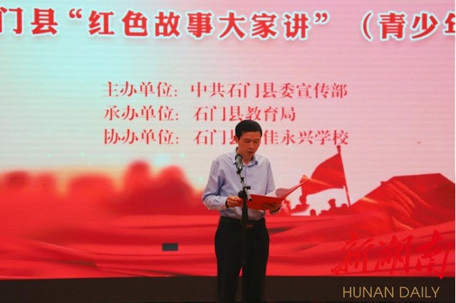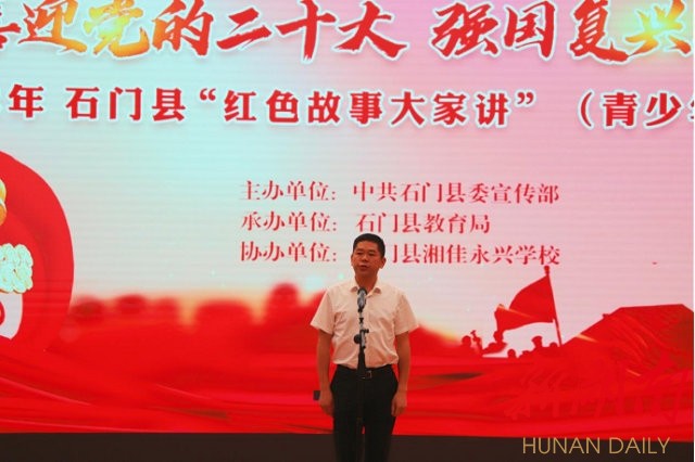 该县教育局党组书记、局长李世辉致辞。他指出,无数革命先辈的付出像一座座丰碑矗立在我们面前。希望青少年能够铭记革命先烈,常念先烈故事、传承先烈精神,以此滋润个人的心灵;教育工作者要从红色故事中汲取力量,把爱国情、强国志、报国行融入到石门教育的高质量发展的奋斗中。