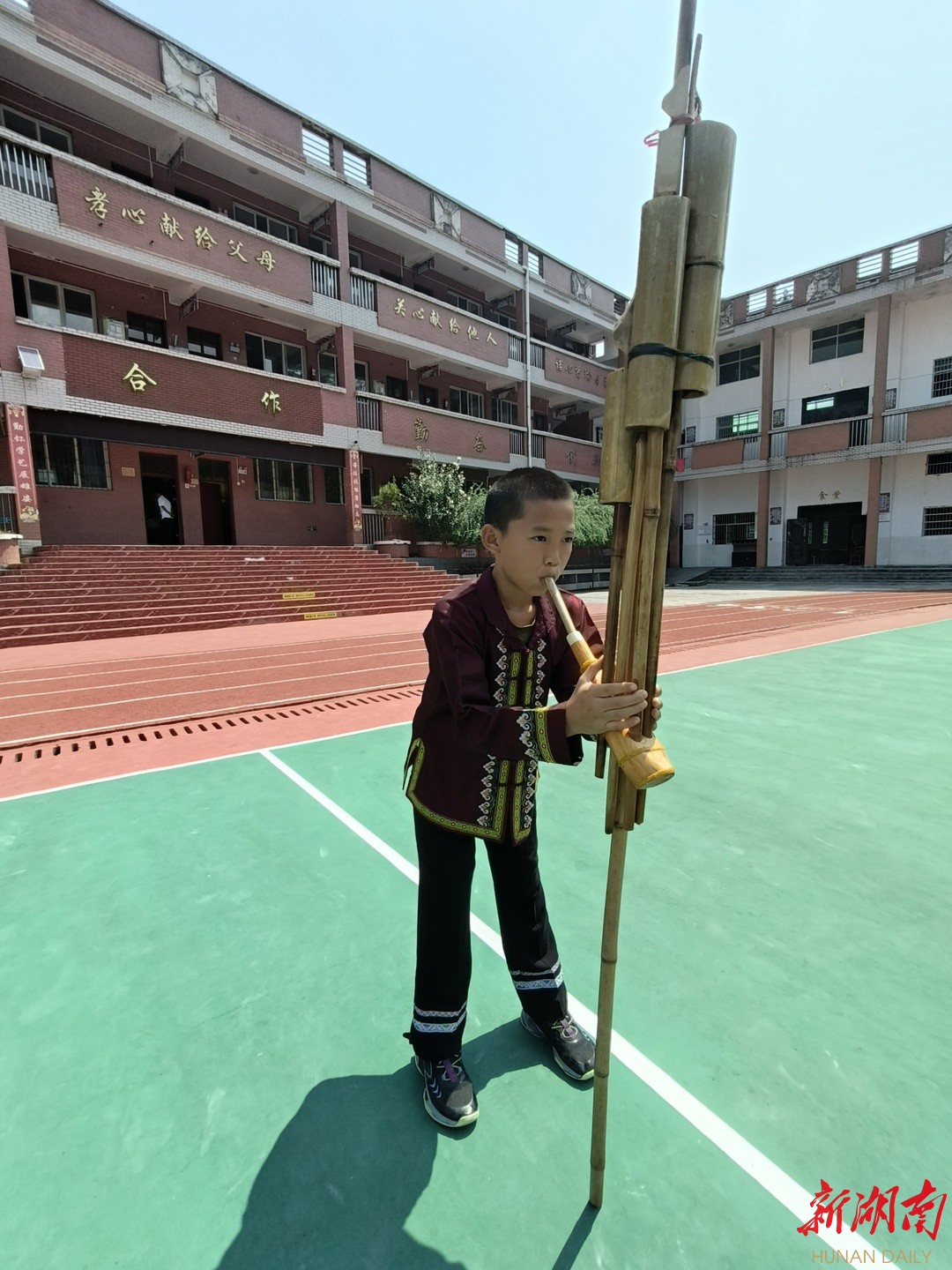 “班上有30多名同学,一半以上都加入了芦笙队。”杨昀的班主任杨妮尔是土生土长的侗乡人,她见证了母校的发展和学生的变化:“现在的侗乡娃和我们以前很不一样,他们向世人展示着更加自信、健康的新面貌。”杨妮尔表示,她时常看见身为班长的杨昀利用课余时间,组织基础较差的队员练习芦笙,“她一遍遍示范,努力不让一个人掉队”。在教室、在操场,学生们卖力地吹奏着芦笙,欢快地跳着芦笙舞。大家都有一个共同的愿望:把侗族芦笙传统文化传承下去。