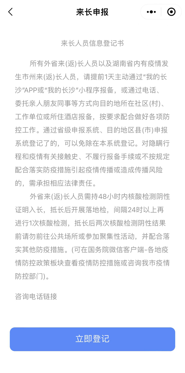 来长返长提前报备。主动劝导国内疫情中高风险地区和已有本土感染者报告地区的家人亲友暂缓来长返长。上述人员和省外人员确需来长的,应持48小时内核酸阴性证明,并需提前24小时通过“我的长沙”APP及微信小程序或直接向目的地社区(村)报备,抵长后主动在交通站场或高速出口(公路防疫服务点)接受1次核酸“落地检”,来长后前三天进行核酸“3天2检”,第3天核酸检测结果出来前不出入人群聚集场所、不参加聚集活动、不乘坐公共交通,并配合落实相应健康管理措施。