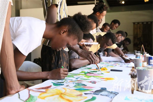 在乌干达分会场,当地师生和民众观看湘潭大学特别制作的“齐白石艺术人生”视频,以此了解齐白石的艺术生涯与坚守。学生们还带来了自己提前准备好的线稿,尝试通过中国画的绘画方法进行描摹和上色。