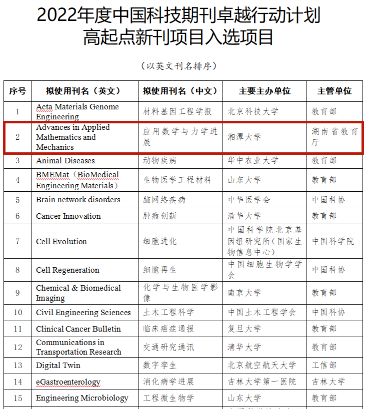 湖南日报·新湖南客户端9月23日讯(通讯员 贺心怡 )9月20日,2022年度中国科技期刊卓越行动计划“高起点新刊”项目评选结果发布,湘潭大学主办的英文学术期刊《应用数学与力学进展(Advances in Applied Mathematics and Mechanics)成功入选。今年全国共有177本期刊申报,经过专业评估和答辩,最终有50本期刊入选。
