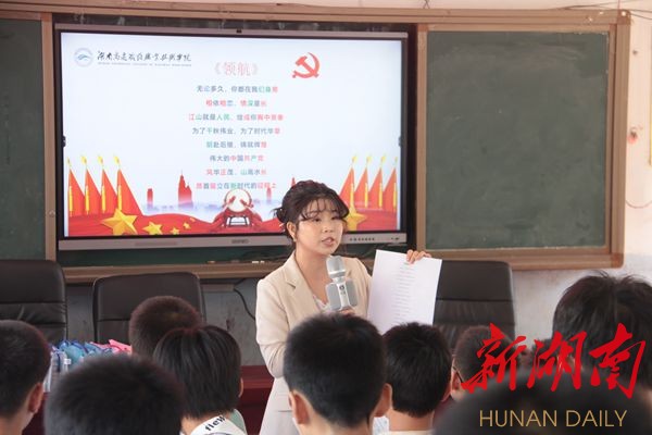 笔者在黄土铺中学多媒体教室看到,湖南高铁职院省级普通话水平测试员李亚萍老师以朗诵《领航》歌词为内容,带领学生做普通话正音讲练,调动了孩子们学习普通话的兴趣,让孩子们学中有乐。人文素质学院副院长周姝老师打着节拍,一句一句教唱这首令人心潮澎湃的歌曲,让孩子们从高昂奋进的旋律中体会爱党爱国为民之情。