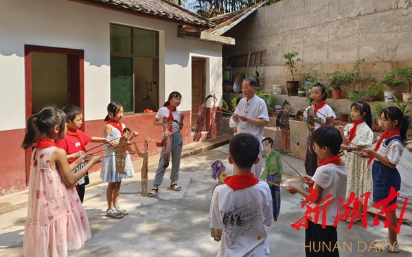 活动中,欧阳新年带领学生们参观他的皮影戏展览馆,向学生们生动讲解衡山皮影戏的相关知识。随后,欧阳新年拿出皮影戏的人物道具,给每个学生发放一个,现场进行操作示范并讲解操作要领。有了孩子们的参与,古老的皮影戏显得更具生机和活力。
