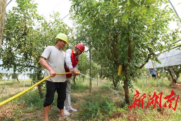△9月15日,国网衡阳供电公司东方红(衡阳红雁)共产党员服务队在祁东县振华果园与果农一同为果树浇灌。(张雁 摄)