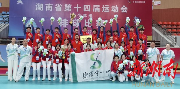 湖南日报·新湖南客户端9月15日讯(通讯员 刘威)9月14日上午,从湖南省第十四届运动会上传来喜讯,在湖南省第十四届运动会排球决赛中,代表衡阳市出征的衡阳市八中男、女排球队扬威省运会赛场,男子排球队代表衡阳队再次夺得冠军,成为继2018年以来蝉联第五次男排的省冠军。女子排球队代表衡阳队奋勇拼搏,再次蝉联季军。衡阳代表队获得体育道德风尚奖。