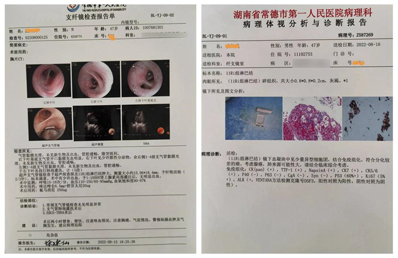 患者为中年男性,今年因头痛伴乏力收住常德一医神经外科,做头部磁共振,考虑是脑转移瘤。经过全面检查,最后发现肺部有结节及肺门淋巴结肿大,进行支气管镜检查,未见明显异常表现。考虑到患者肺部病灶靠近肺门,如果做肺穿刺或者脑穿刺检查,创伤及风险相对较大。呼吸与危重症医学科团队在主任裴文军、副主任梅牧和王天立的带领下对患者病情进行了充分的评估,最终制定了详细缜密的诊治方案,由徐建仙副主任医师具体实施超声内镜引导下经支气管针吸活检术。在多位医护人员共同努力下,术中术后患者感受良好,未出现不适症状,术后病检明确了肺癌类型,也为后续治疗奠定了基础。