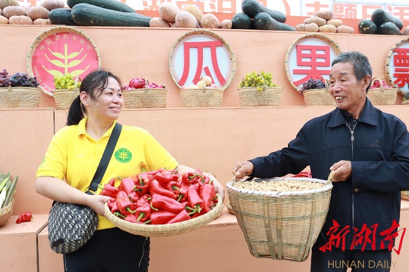 五谷丰登,瓜果飘香,稻菽卷起千层浪。9月23日一早,汨罗市长乐镇马桥村农户熊岳飞带着自家农场种植的“马桥辣椒”等农产品,赶来该镇长乐村,参加中国农民丰收节全国供销合作社(湖南汨罗)主题日活动。他说:“今年农场200多亩辣椒大丰收,这么好的晒丰收机会可不能错过!”