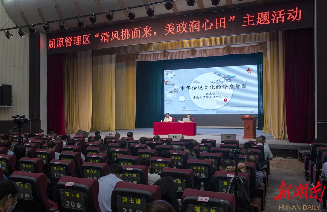 当天,屈原管理区以“清风拂面来,美政润心田”为主题开展清廉建设相关活动。除上演廉政花鼓戏外,还邀请了中南大学哲学系副教授谭忠诚进行廉政主题授课,他带领大家“从中国传统文化中汲取修身智慧”,讲述修身乃为人之本、修身在正其心、养心莫善于寡欲、修身之道等内容。