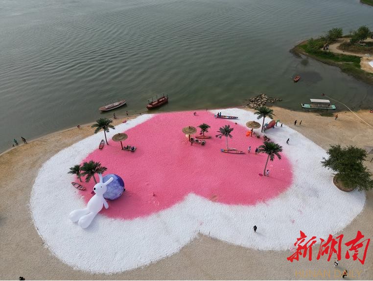 记者在现场看到,胭脂湖畔的沙滩被精心布置了一番,有红色与白色砂石圈成的爱心,有巨大萌宠造型供游客拍照,有棕榈树配沙滩椅,还有快艇等带大家体验刺激的水上运动。