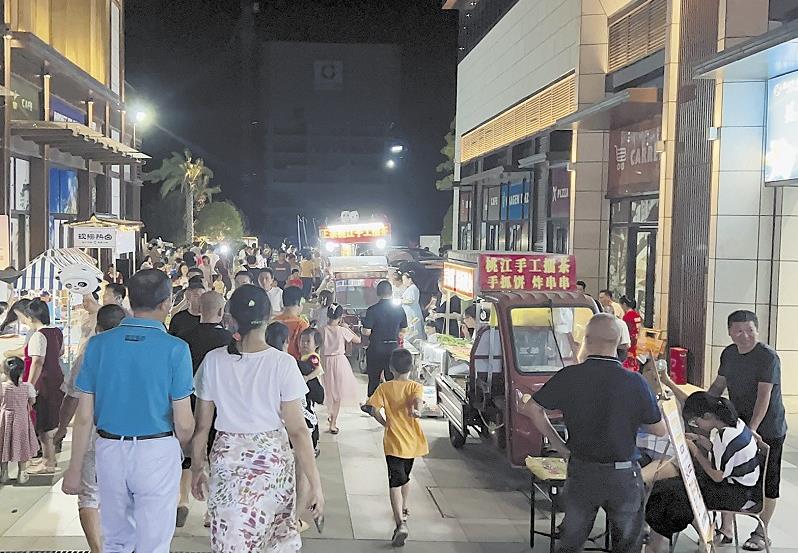 除了最受人们欢迎的美食和孩子们爱玩的蹦床、射击、套圈圈、钓鱼,市集上还设置了文创手办、二手物品置换、文艺演出、房车露营等项目,为这个夜市增添了十足的“文艺范儿”。商业街广播里不时地推荐着各个摊位的特色产品与促销打折优惠,物业保洁人员穿梭其间及时清扫整理,安保人员来回巡逻维持秩序。