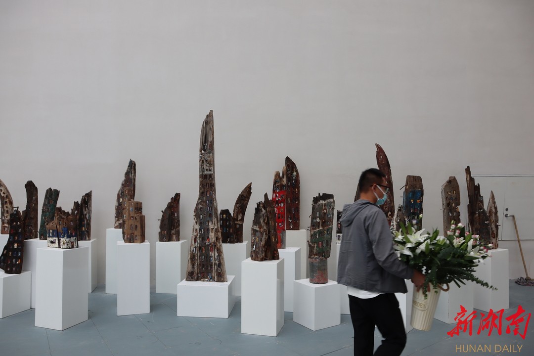 本次展览共展出作品143件,其中油画80幅,紫砂和船木雕塑等62件、1件巨型装置艺术“巴别塔”。这些作品分别陈列在“百年对话”“世界之窗”“时代镜像”“高速时代”四个主题展览空间,特别装置艺术“巴别塔”置于入口厅。