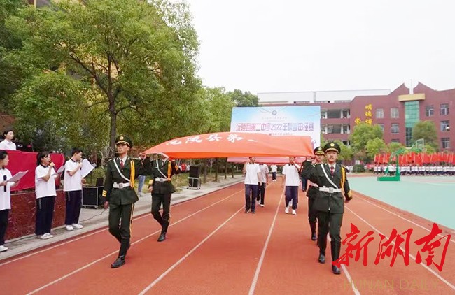 湖南日报·新湖南客户端9月30日讯(通讯员 周浏军 彭金红)9月28日上午7点,沅陵二中的操场上彩旗飘扬。伴随着激昂的运动员进行曲,国旗队、校旗队手执红旗,精神抖擞地迈过主席台;田径队、篮球队、体舞队以及53个班级方阵口号嘹亮、英姿勃发,整齐划一地缓缓入场。