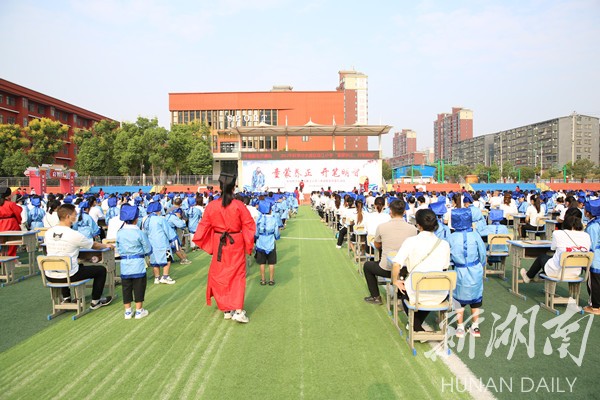 湖南日报·新湖南客户端9月16日讯(通讯员 唐梦 阳国良 邹淑娟)9月16日,冷水滩区春江小学举行“童蒙养正,开笔明智”一年级新生开蒙礼活动,450余名一年级新生身着汉服,与家长一起共同走过“启智门”,开启人生重要的学生生涯。