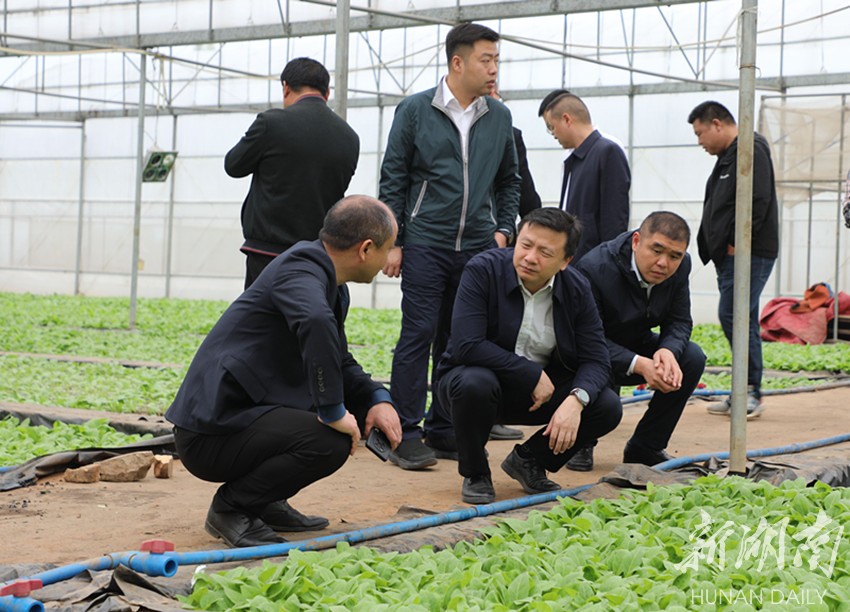 东安县委书记唐何(前排中)在紫溪市镇大源村调研指导春耕生产工作。 刘联波 摄