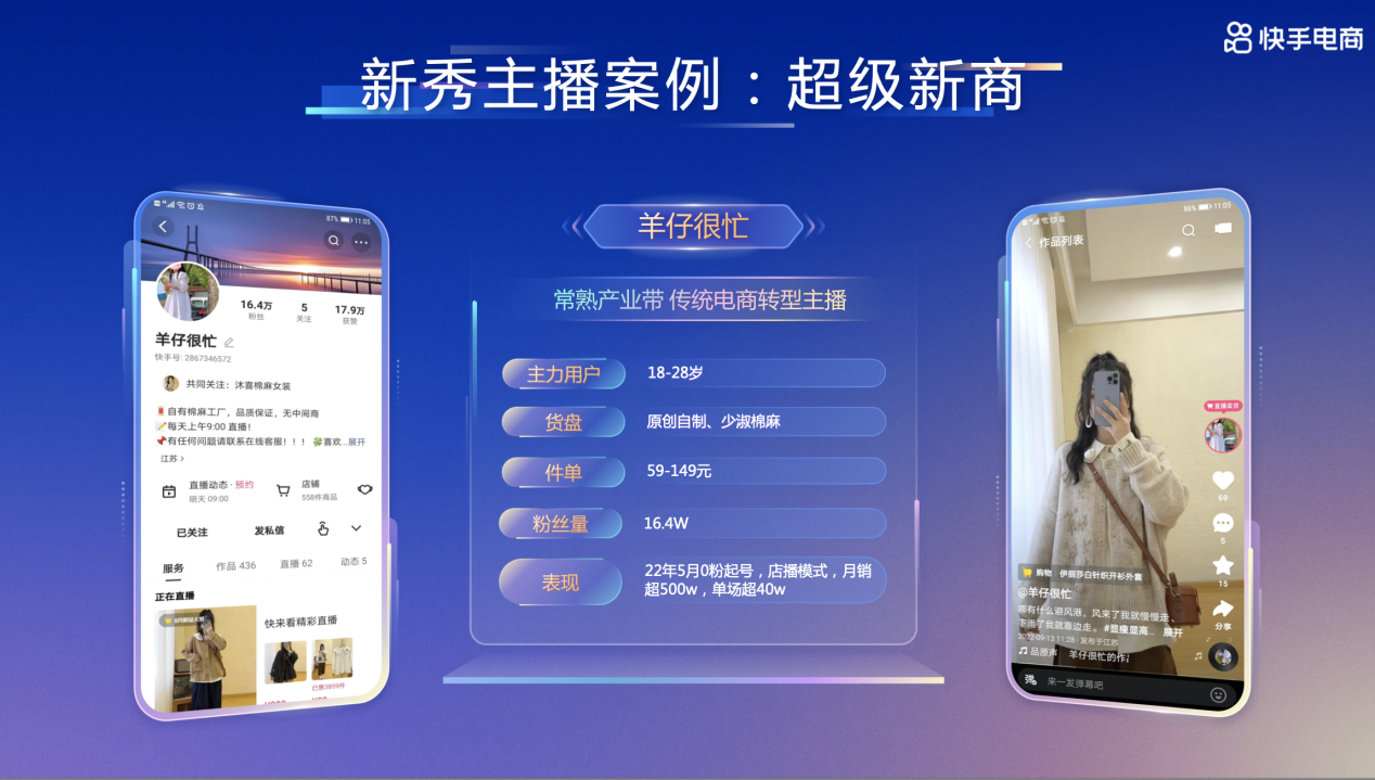 该成长路径的有效性也得到了产业带转型商家的验证。常熟产业带转型、主营特色棉麻的商家“羊仔很忙”(快手ID:2867346572)5月起号,目前月销超500w,单场最高GMV超40w ,“舒艺原创女装”(快手ID:X18520922771)7月开播,首月GMV即突破200万,单场最高GMV超40万;广州产业带线下档口转型商家“花朵.高端女装”(快手ID:1290875878)7月首播,月销1000万+,单场最高GMV达200万+;杭州产业带转型商家“哦哦三妹-”(快手ID:sanmei3333)去年12月开播,如今月销800万+,单场最高GMV超200万。
