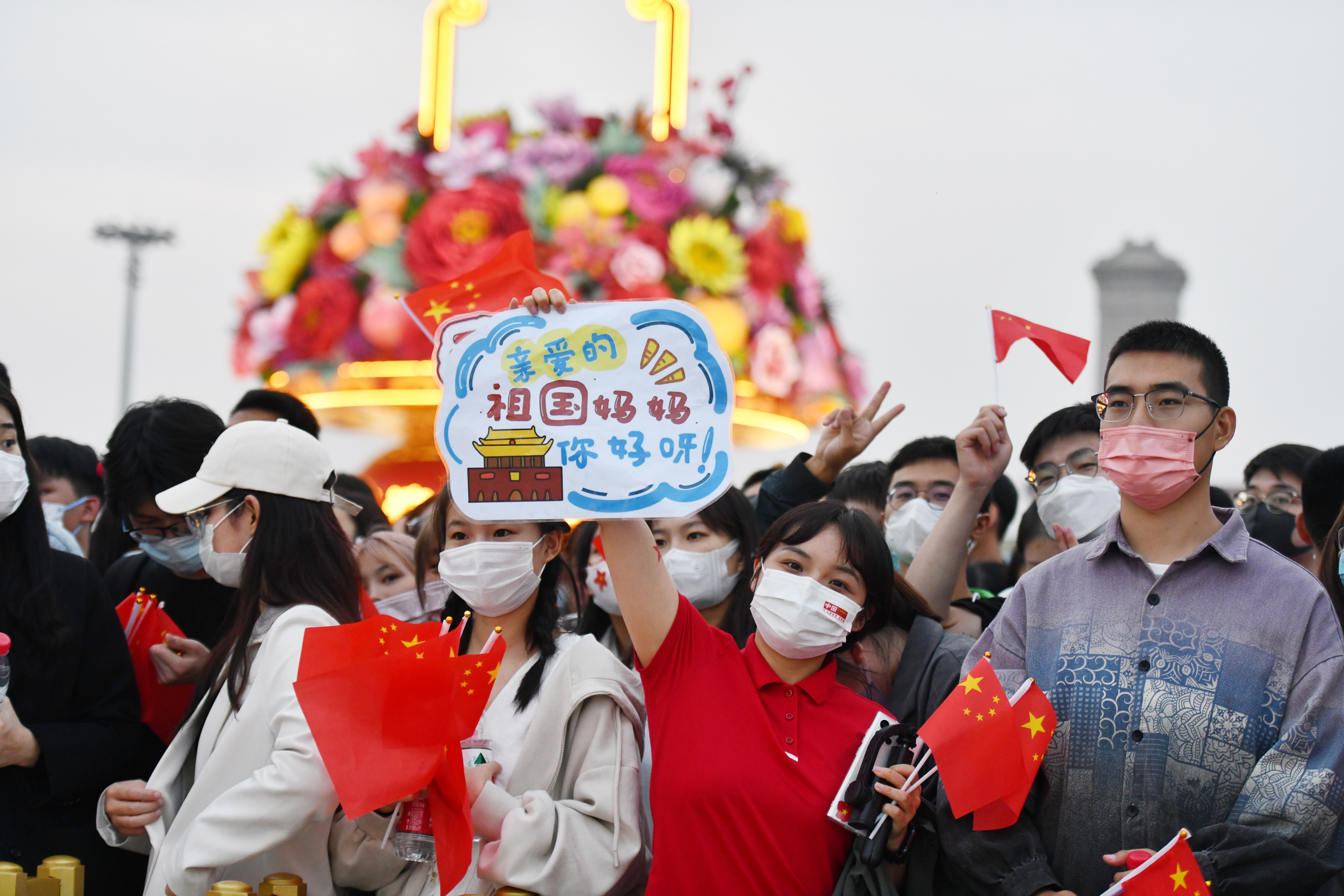 巫韦微和好朋友专程从通州赶来。“我们昨晚7点多就出发了,就是为了占据最佳位置。”巫韦微告诉记者,自己8月份刚陪朋友来天安门参观旅游过,但在国庆节当天再来意义特殊,“今天我们的安居乐业离不开祖国的繁荣富强,我们想在现场送上生日祝福!党的二十大即将召开,也希望祖国越来越好!”