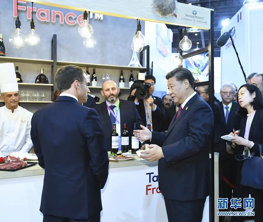 2019年11月5日,国家主席习近平在上海出席第二届中国国际进口博览会开幕式后,同与会外国领导人共同巡馆。图为习近平在法国总统马克龙陪同下巡视法国馆。新华社记者 谢环驰 摄开幕式后,习近平在马克龙陪同下来到法国馆。马克龙请习近平品尝法国红酒和牛肉食品。习近平说:“法国牛肉、红酒在中国很受欢迎。”面对围拢在身边的20多位法国企业家,习近平发出诚挚邀请:“欢迎法国企业到中国来,中国市场大。”3年后的今天,中法双向投资快速增长,双边贸易额已超800亿美元,创历史新高。2019年3月,在尼斯会见期间,习近平对马克龙愉快地讲起中法友好交往的历史。两位元首走到海边,眺望远方。静谧的夜,涛声阵阵。习近平说:“两国人民有着特殊友好感情,这是一笔宝贵的财富。我们要继承好、发扬好,使中法关系继续走在时代发展前列。”