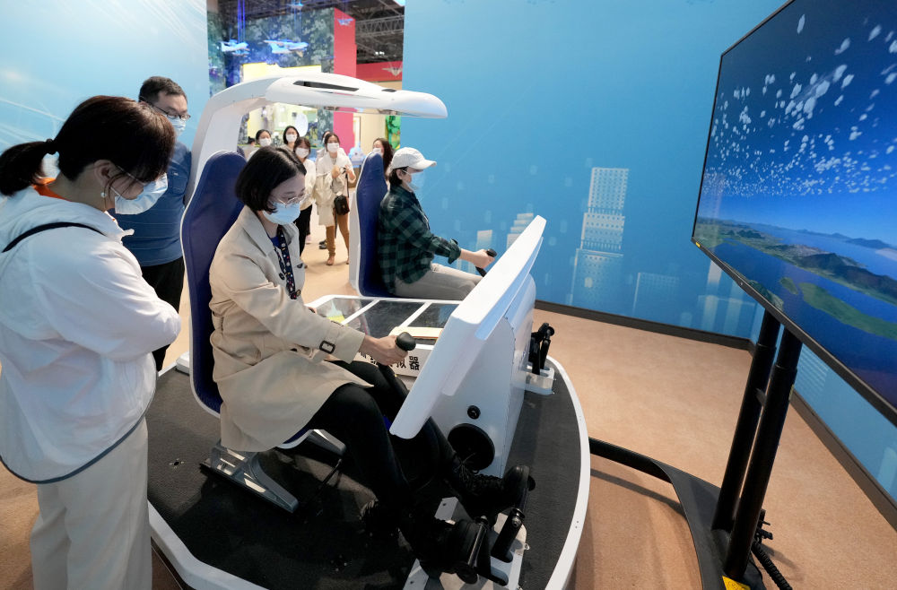10月7日,观众在“奋进新时代”主题成就展上体验操纵直升机训练模拟器。新华社记者 王毓国 摄