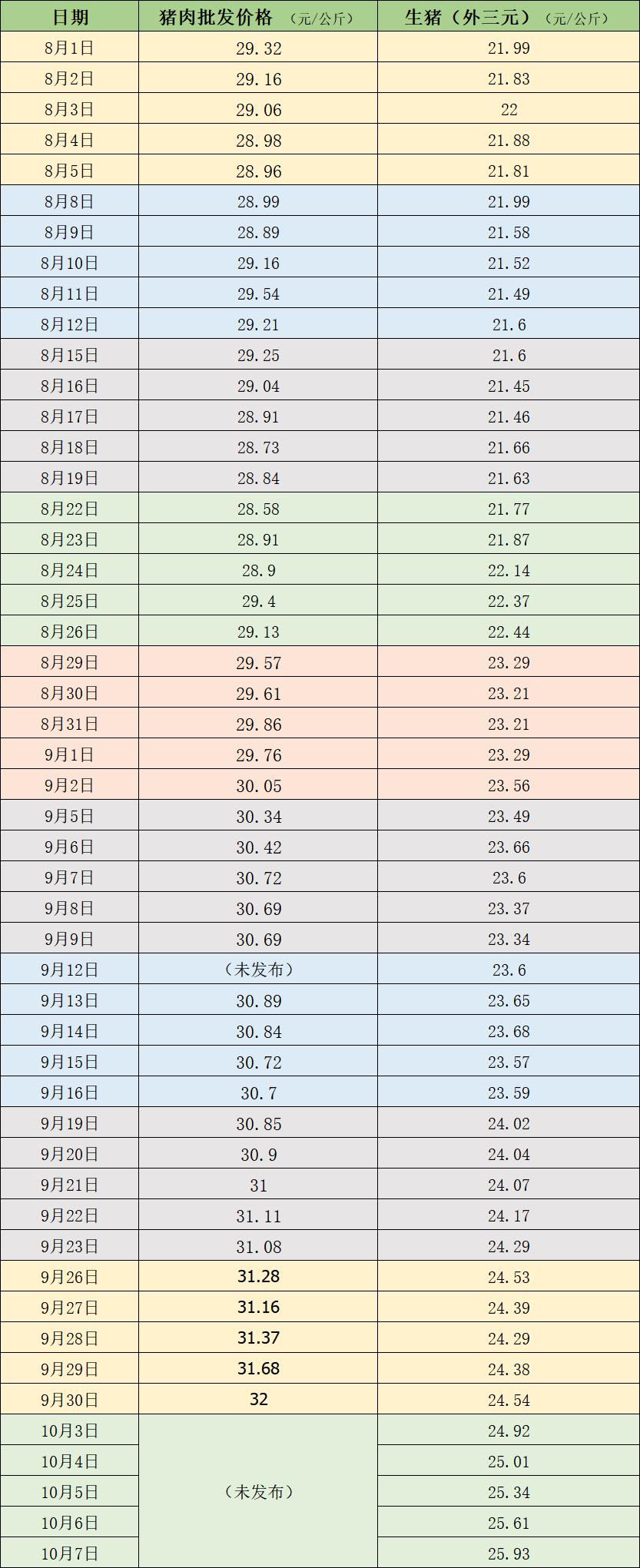 本周农业农村部的全国农产品批发市场猪肉平均价格尚未公布。从生猪价格来看,本周国内生猪价格呈连续上涨走势,全国均价每公斤上涨约1元。据中国养猪网的数据,10月7日,生猪(外三元)价格为25.93元/公斤,与上周五(9月30日)的24.54元/公斤相比,上涨5.7%。从周内来看,本周生猪均价为25.36元/公斤,与上周24.43元/公斤的均价相比,上涨3.8%。