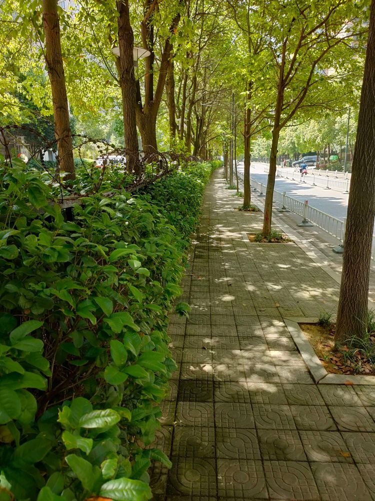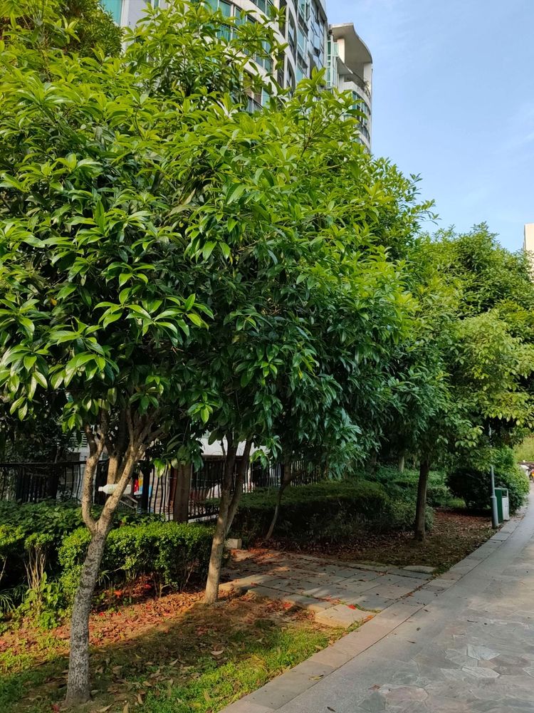 今天,闲来无事,晾台上摆上一杯茶,放眼望去,满眼碧绿。人行道两边绿蓠是四季桂,树不高,都是灌木,像一条条绿色的长龙蜿蜒于小区之间。四季桂的花是白色的,四季有花,花小,躲在茂密的叶片里,羞涩地打量着过往的行人。