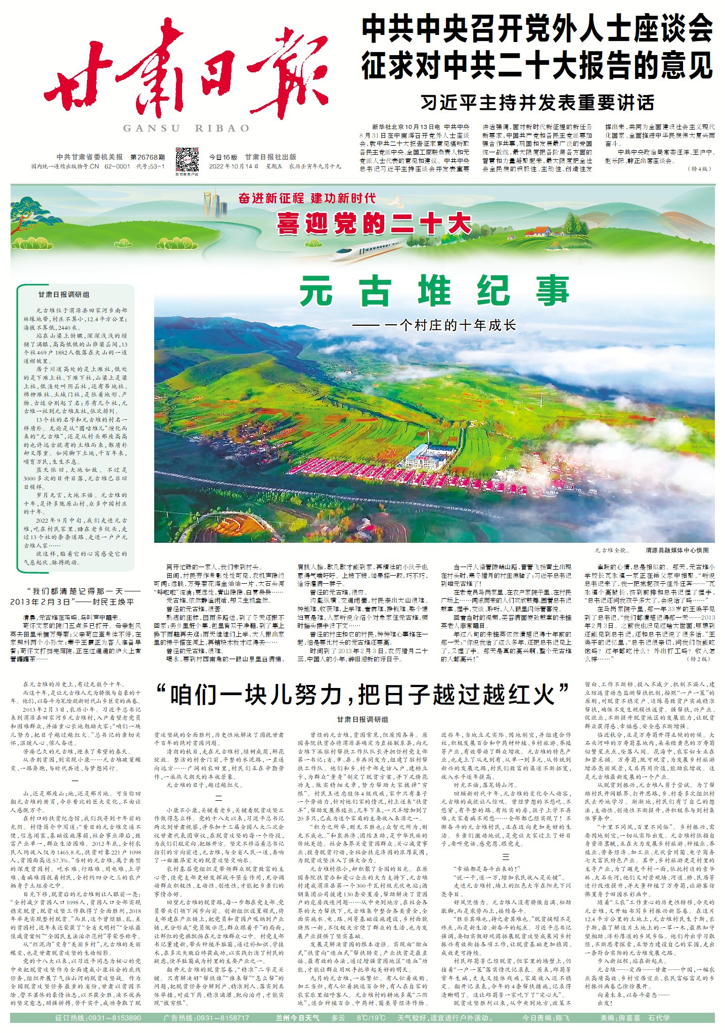 2021年底,渭源县提出以基础设施、产业发展、公共服务、乡风文明、生态保护、人才开发、文化繁荣、收入增长、基层治理、党建引领“十个走在前”为目标,全力将元古堆村打造成全省乡村振兴示范村、全市乡村振兴渭源样板……
